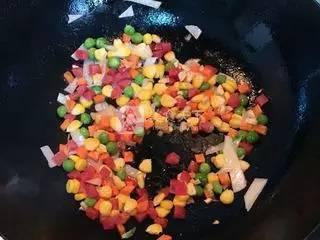 5. 倒入浸泡好的米饭,快速翻炒均匀;